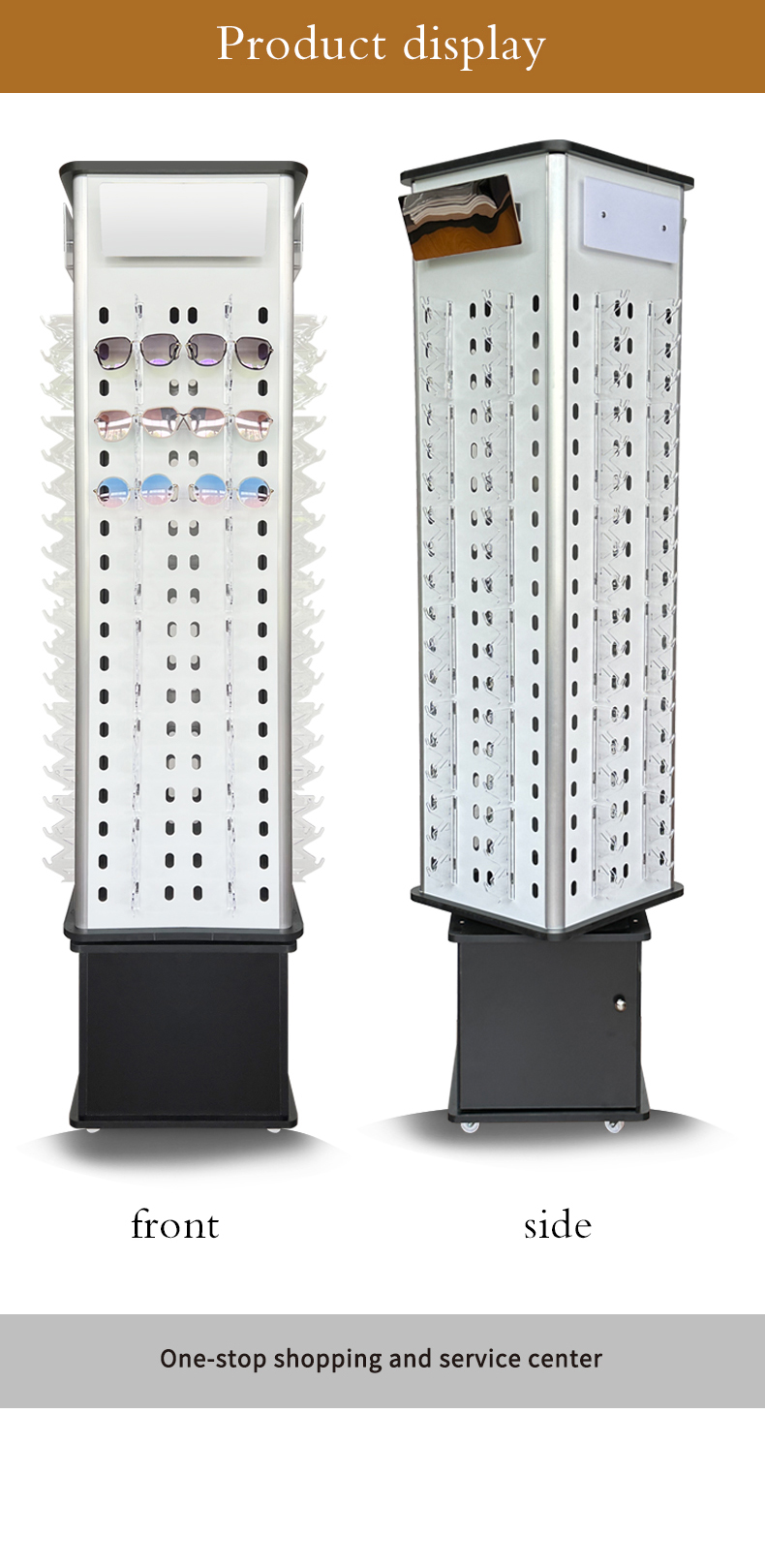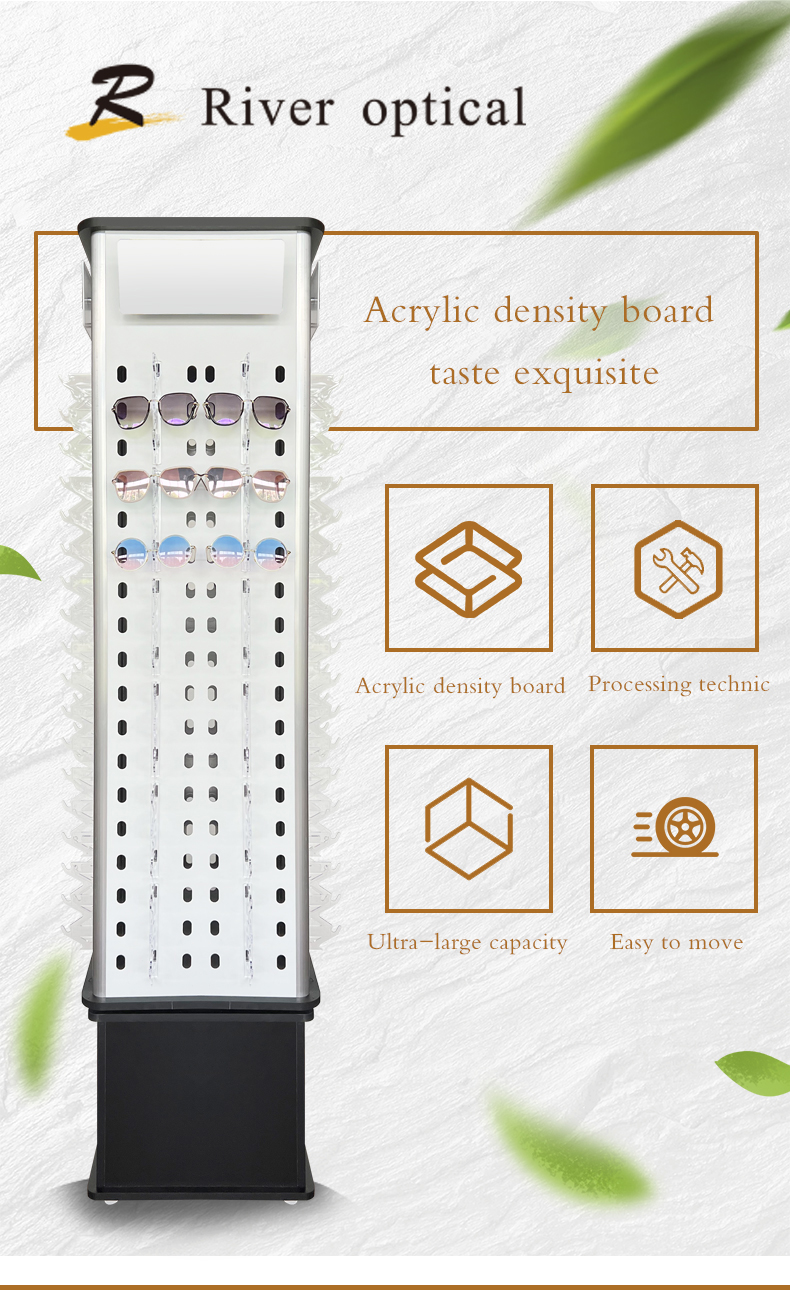 Short Description: Custom made eyeglasses display stand to fit your brand. Available in materials like wood, acrylic, and leather for unique shop furniture.